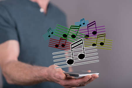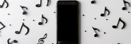 Smartphone phone with treble clef on display and musical notes on white background. Apps to listen music on your phone