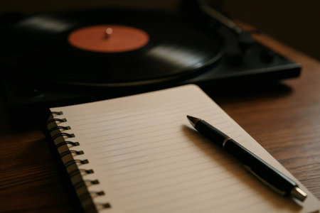 Notebook and pen resting on wooden table with record player spinning in background, evoking creative atmosphere