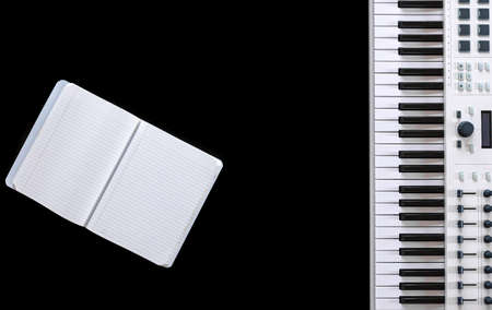 Classic piano and musical sheet . Black and white photo, Musical Background