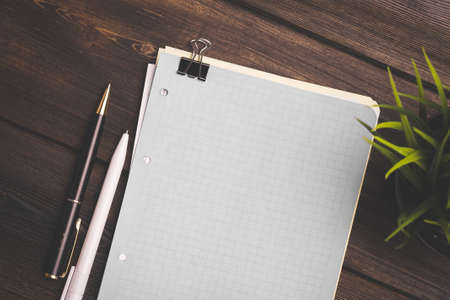 Sheets of paper for writing and a pencil pen clamp wooden table flower in a pot