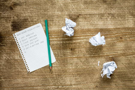 List of resolutions for new year on scratched wooden background
