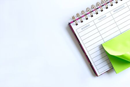 Weekly planner organiser with green sticky note on white background. Stationery flat lay. Back to school, office, business plan concept. Horisontal