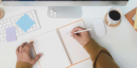 Overhead shot of male taking note on blank notebook on white office desk with computer device, camera and coffee cup
