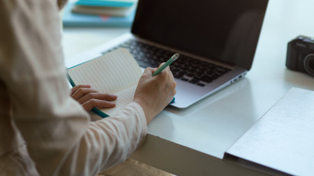 Cropped shot of female hand writing on blank notebook while working with laptop on office desk