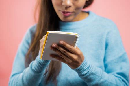 Hands of woman making notes in planner, mature lady holding pen. She writes future plans and to-do list in notebook for week or month. Keeping personal diary on pink studio background.