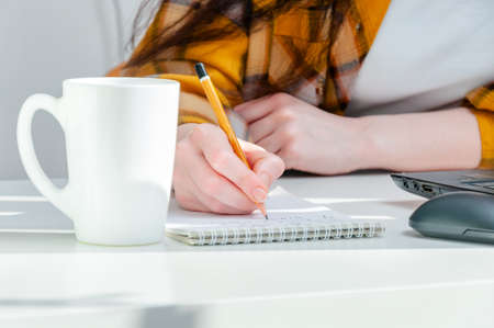 Close-up woman holding pencil in hand writing in notepad on workplace with coffee cup and laptop. Woman working at home