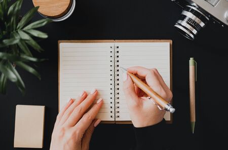 Top view of a flat lay woman's hand writes a note in an open notebook lying on a black table next to the camera with a pen and writing paper. The concept of home accounting. Advertising space