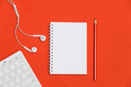 Minimal workplace with blank notepad, keyboard and supplies on colored background. Top view. Flat lay