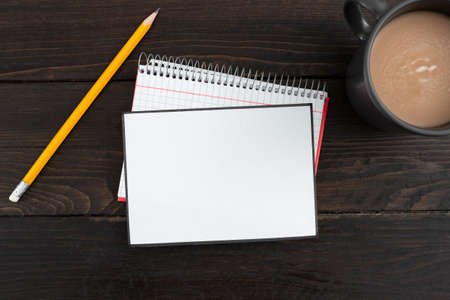 Blank Paper With Spiral Notebook, Pencil And Coffee Mug Over Wooden Background. Empty Sheet With Stationery And Drink On Table. It Is Showing Important Business Information.
