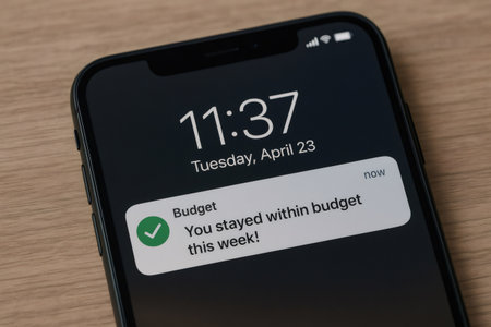 Budget success notification pops up on a smartphone screen, informing the user that they stayed within budget this week