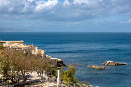 Wondeful aerial view at sunset of the Tafuri castle and the coastline of Portopalo, a town in the south of Sicily. The shot is taken during a beautiful sunny day