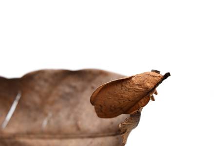 The Lasiocampidae, Eggars, Snout moths, Lappet moths, Brown butterfly moth on dry leaf isolated on white background, Insects that are shaped and color like leaves, Thailand