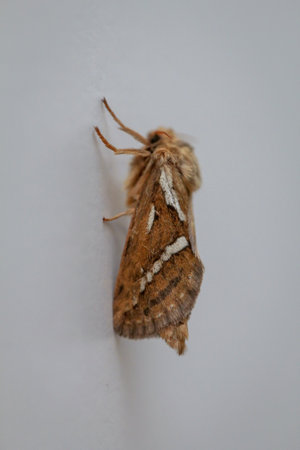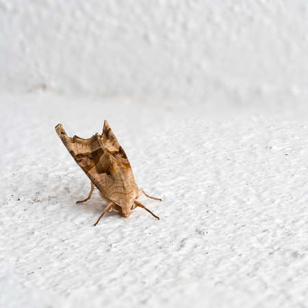 moth on a white wall, closeup of photo with shallow depth of field. Side view of a small hop rootworm on a wall.