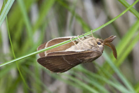 large moth sleeps on green grass stalk