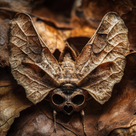 A unique moth with expansive leaf like wings is nestled among fallen dried leaves showcasing its remarkable ability to blend into the natural environment. The moth