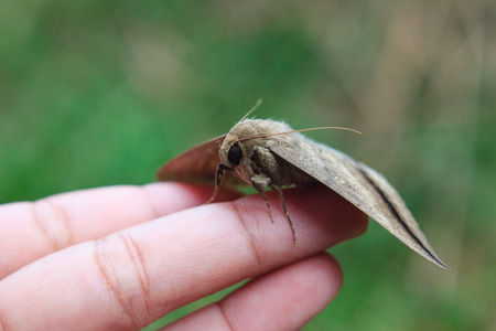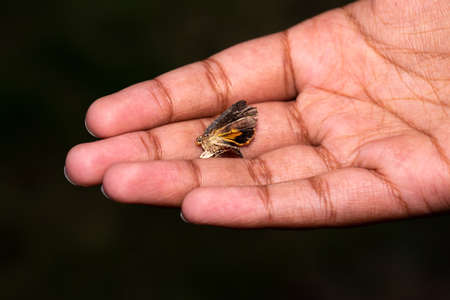 A dead moth lying on a human palm hand macro close up image