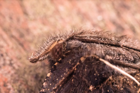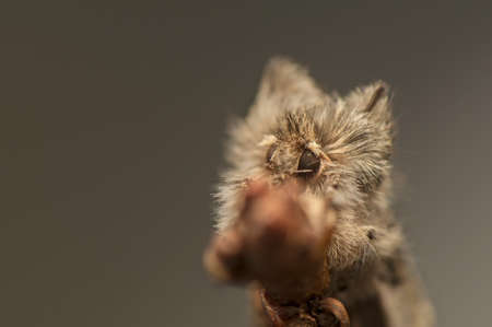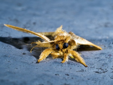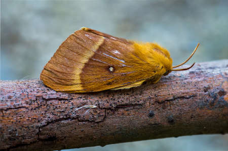 Natural closeup on the pale oak eggar moth, Trichiura crataegi, sitting on wood