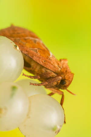 Closeup of a beautiful male orange swift moth, Triodia sylvina, on a green leaf