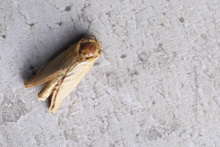 Brown common clothing moth on gray textured background, top view. Space for text