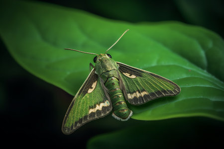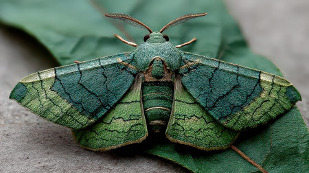 This stunning close-up captures the intricate details and vibrant colors of a green moth resting on a leaf, showcasing nature's delicate beauty and diversity.