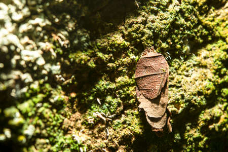 Close up of moth disguises itself on a tree in a moss