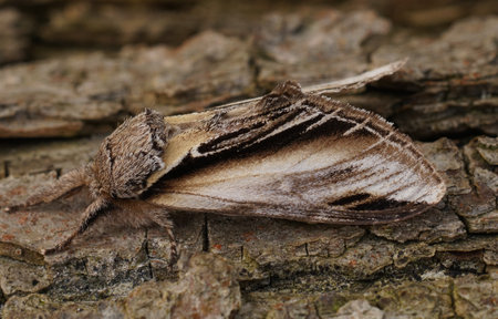 Natural closeup shot of the swallow prominent moth, Pheosia tremula, sitting on wood