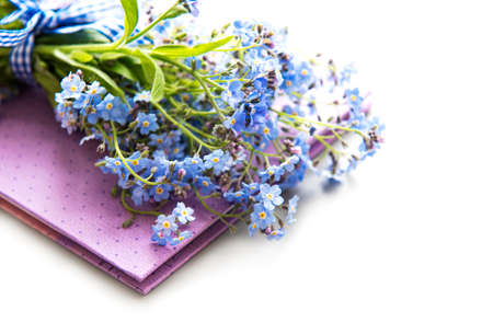 Forget me not flowers and notebook on white background