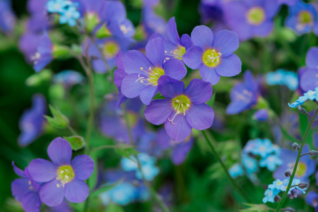 A top view of the beautiful blue flowers of forget-me-nots, growing in the twilight of a summer evening, surrounded by nature.