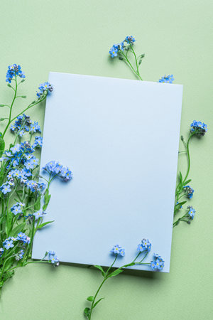 Greeting or invitation 5x7 card design, empty blank card and floral decor on green background, copy space for text. Creative mockup with wild delicate blue forger-me-not flowers.