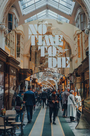 London, UK - October 02, 2021: People walking under 007 installation dedicated to the release of No Time To Die inside Burlington Arcade, the original luxury department store in London.