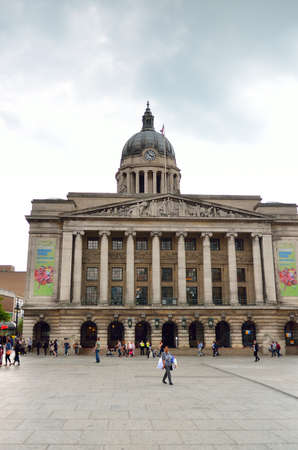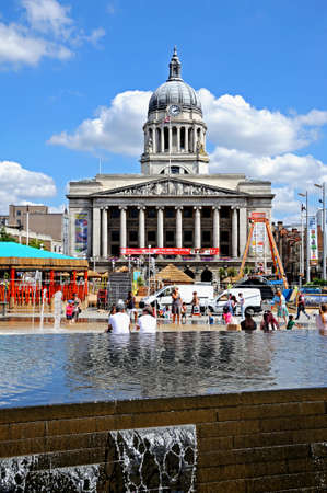 Nottingham, United Kingdom - July 17, 2014 - Council House also known as the city hall in the Old Market Square with a pool and fountain in the foreground, Nottingham, Nottinghamshire, England, UK, Western Europe.