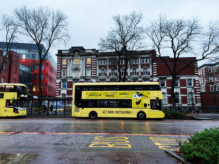 Manchester, UK - December 06, 2025: Yellow bus on a wet Manchester street with leafless trees and red brick buildings, urban city scene.