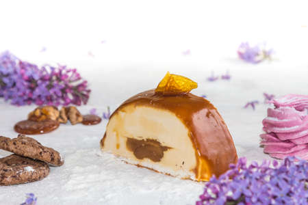 Beautiful piece of cake, marshmallow, cookies and caramel with nuts