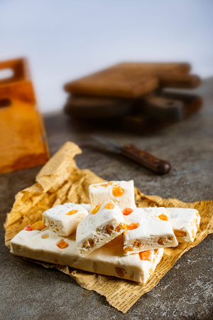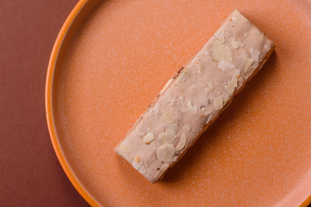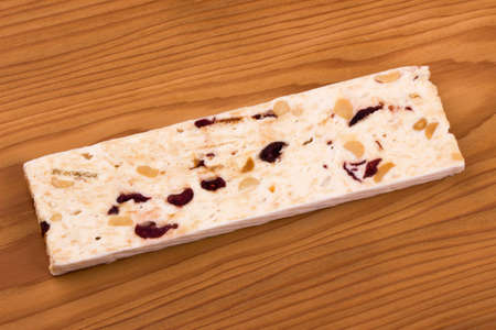Italian festive torrone. Nougat with almonds. Breakfast consept