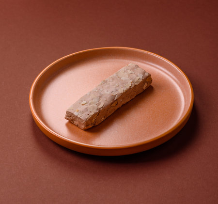 Eastern Arabic nougat sweetness with pistachios on a brown ceramic plate on a light background. Top view
