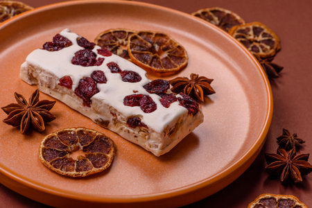 Torrone or nougat bar with nuts and red dried berries. Traditional italian dessert close up on pink background. Sweet tasty and healthy food
