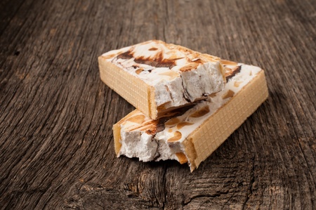 Traditional Christmas sweet, pieces of delicious almond nougat on wooden table (hard nougat)