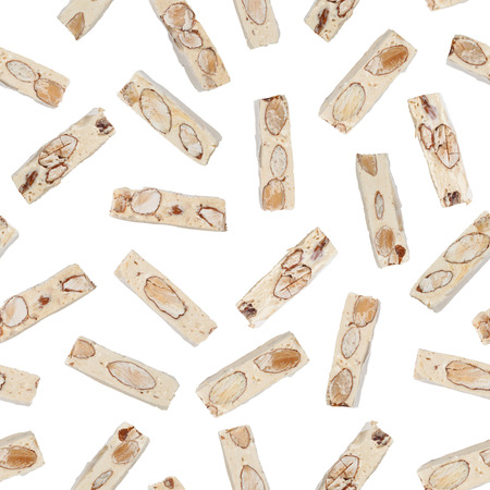 Italian festive torrone (or nougat) with hazelnuts on a white background.