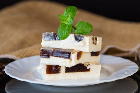 Pieces of soft hazelnut nougat on a dark slate surface.