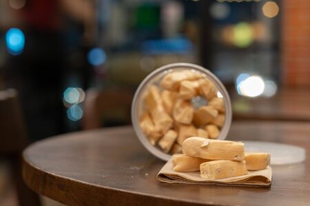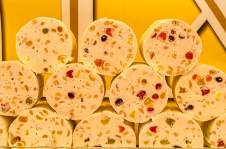 Large portions of home made Nougat confectionary made with sugar or honey, almonds and dried fruits, covered in plastic, displayed for sale at a traditional street food market