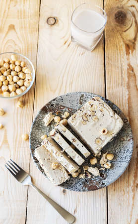 Halwa with hazelnuts and vegan nut milk on the wooden background and backing paper