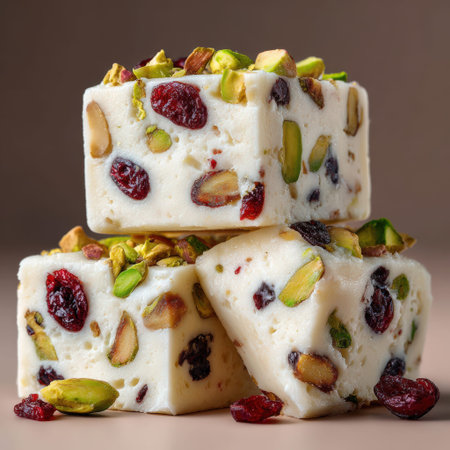 Stacked sweet confection pieces with pistachios and cranberries, highlighting rich textures and colors, ideal for festive occasions and gourmet presentations
