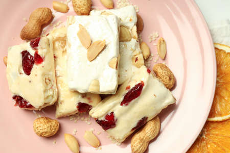 Torrone or nougat bar with nuts and red dried berries. Traditional italian dessert close up on pink background. Sweet tasty and healthy food