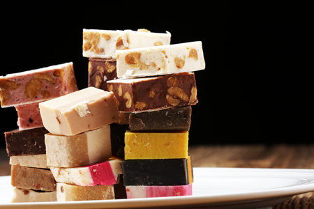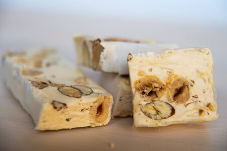 Delicious traditional Italian festive torrone or nougat with nuts on wooden background. Soft nougat blocks with almonds and in diffrent colors. Italian sweets.