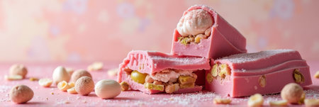 Pink nougat bars with nuts and cream on pink background. That the image is generated using AI.