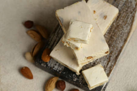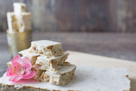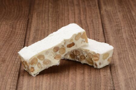 Hard nougat on wooden background, cut into pieces