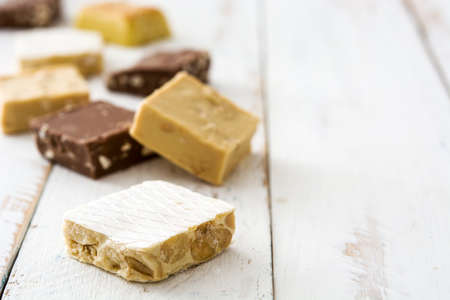 Variety of Christmas nougat on white wooden background