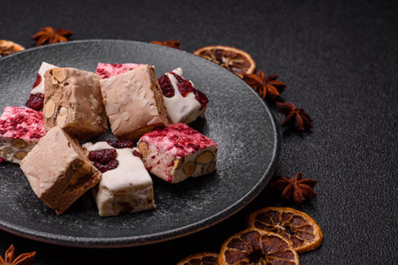 nougat with candied fruits and nuts on wooden background close-up