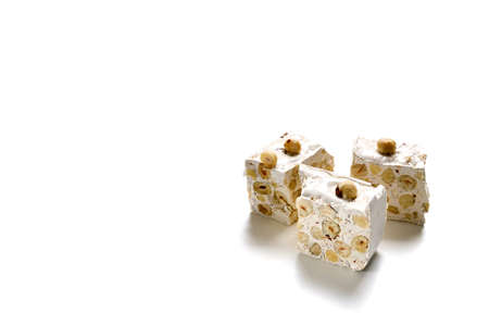 Italian festive torrone (or nougat) with hazelnuts on a white background.