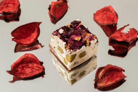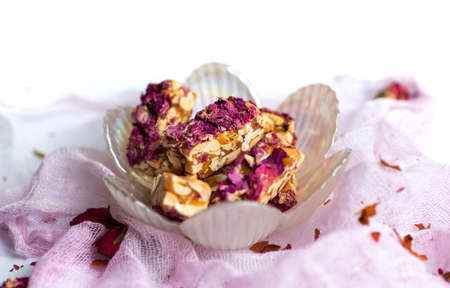 Rose natural candy dessert with natural flowers and peanuts
